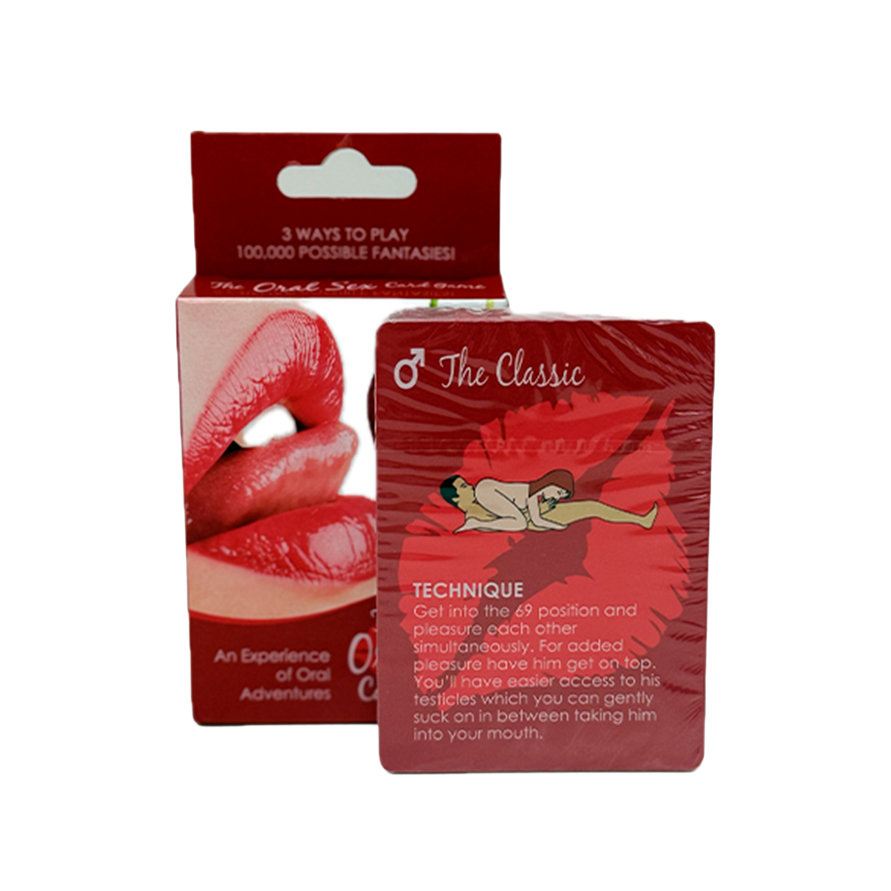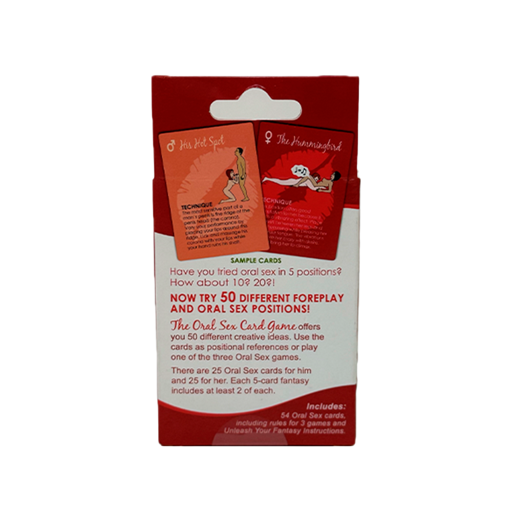 El Juego Juego The Oral Sex Card permite innovar en pareja proporcionando 50 ideas para la práctica del sexo oral. Solo deben escoger una carta que contiene el juego de parejas y realizar la posición sexual que ilustra la tarjeta.